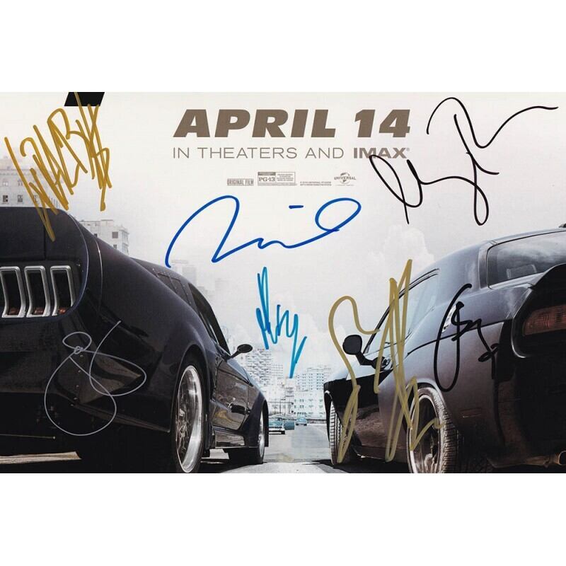 Autographed by Vin Diesel (ヴィン・ディーゼル), Dwayne Johnson (ドウェイン・ジョンソン), Charlize Theron (シャーリーズ・セロン), Michelle Rodriguez (ミシェル・ロドリゲス), Ludacris (リュダクリス), Jason Statham (ジェイソン・ステイサム), Nathalie Emmanuel (ナタリー・エマニュエル), Tyrese Gibson (タイリース・ギブソン), Scott Eastwood (スコット・イーストウッド), and Kurt Russell (カート・ラッセル)