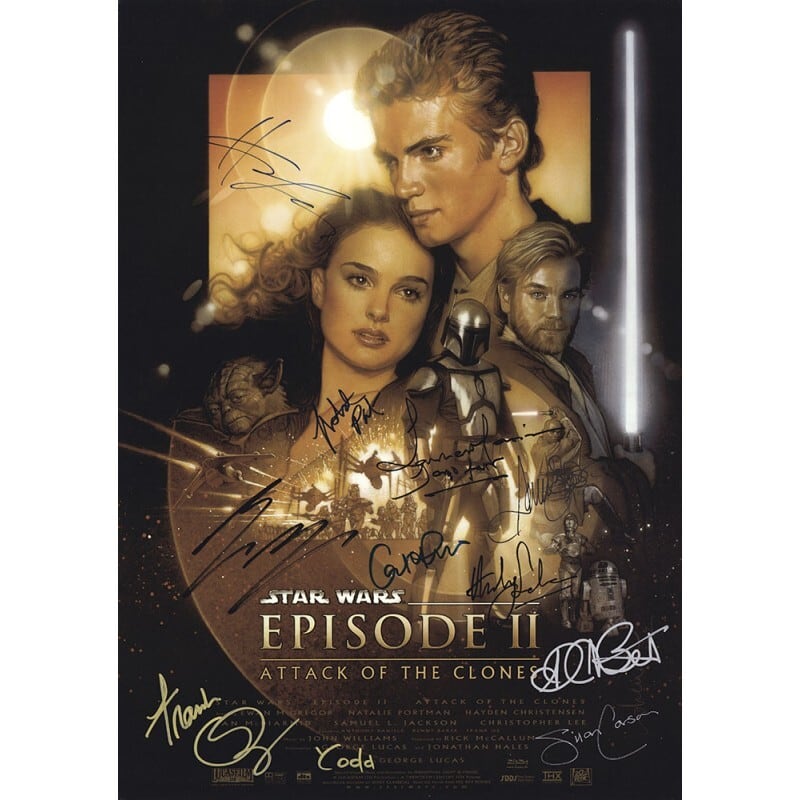 autographed by Hayden Christensen(ヘイデン・クリステンセン), Ewan McGregor(ユアン・マクレガー), Natalie Portman(ナタリー・ポートマン), Samuel L. Jackson(サミュエル・L・ジャクソン), Ian McDiarmid(イアン・マクダーミド), Temuera Morrison(テムエラ・モリソン), Ahmed Best(アーメッド・ベスト), Frank Oz(フランク・オズ), Andrew Secombe(アンドリュー・セコンベ), and Silas Carson(サイラス・カーソン).