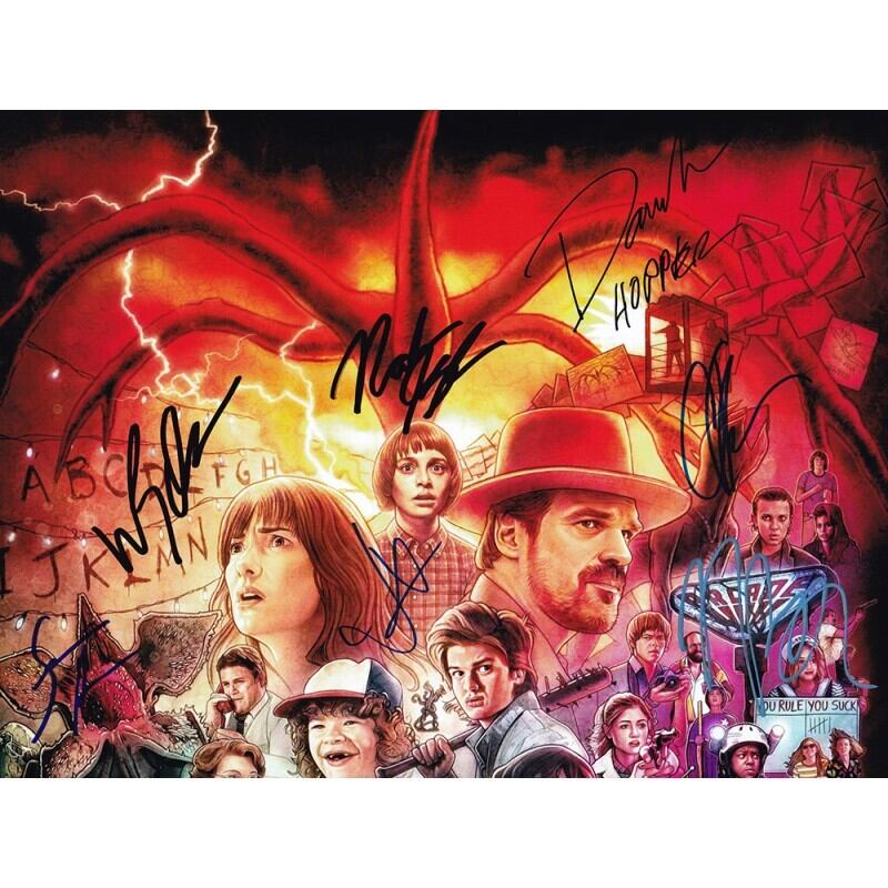 Autographed by Winona Ryder(ウィノナ・ライダー), Millie Bobby Brown(ミリー・ボビー・ブラウン), David Harbour(デヴィッド・ハーバー), Finn Wolfhard(フィン・ヴォルフハルト), Gaten Matarazzo(ガテン・マタラッツォ), Caleb McLaughlin(ケイレブ・マクラフリン), Noah Schnapp(ノア・シュナップ), Natalia Dyer(ナタリー・ダイヤー), Joe Keery(ジョー・キーリー), Charlie Heaton(チャーリー・ヒートン).Sean Astin(ショーン・アスティン),Cara Buono(カーラ・ブオノ), Dacre Montgomery(デイカー・モントゴメリー)