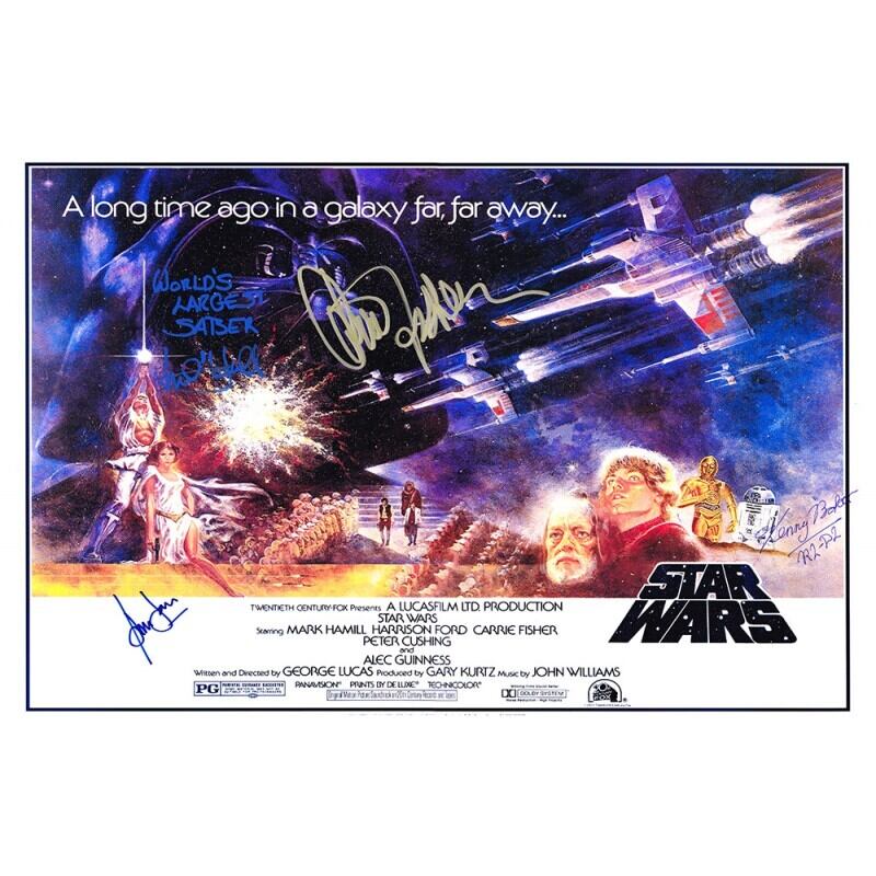 Autographed by Carrie Fisher(キャリー・フィッシャー), Mark Hamill(マーク・ハミル), Harrison Ford(ハリソン・フォード), Kenny Baker(ケニー・ベイカー)