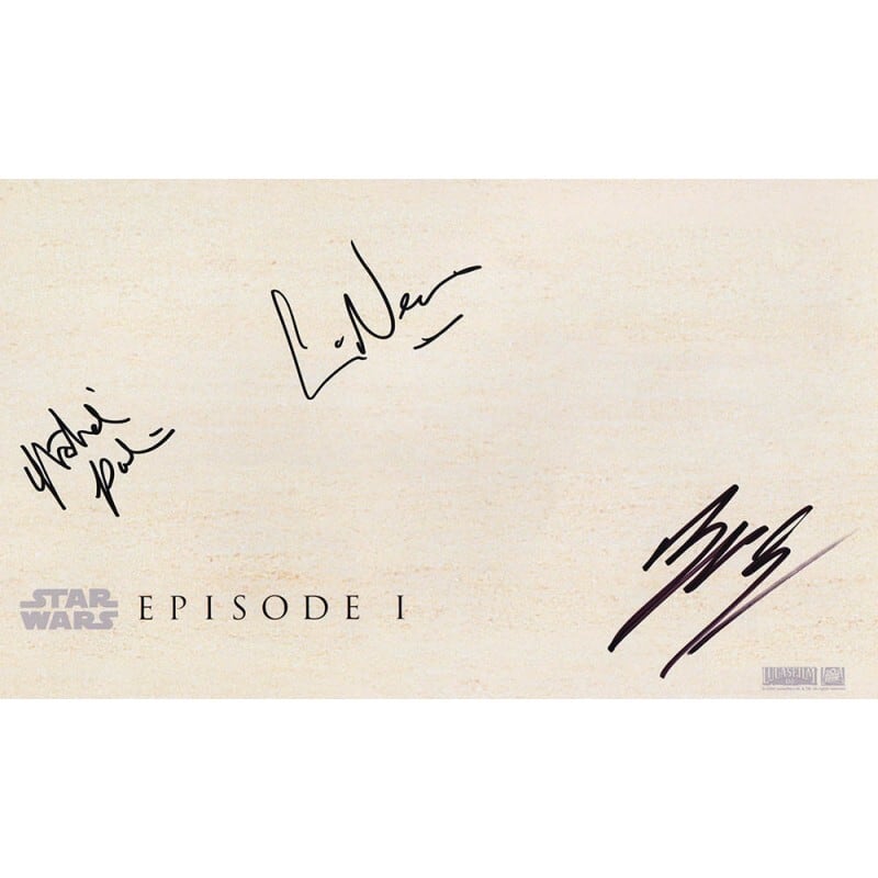 Autographed by Jake Lloyd (ジェイク・ロイド), Ewan McGregor (ユアン・マクレガー), Liam Neeson (リーアム・ニーソン), Ray Park (レイ・パーク), and Natalie Portman (ナタリー・ポートマン)