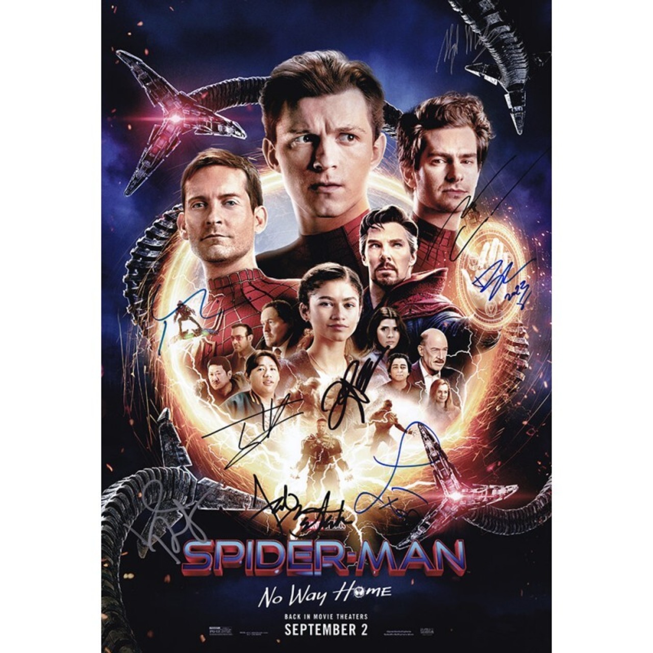 Autographed by Tom Holland(トム・ホランド), Benedict Cumberbatch(ベネディクト・カンバーバッチ), Tobey Maguire(トビー・マグワイア), Andrew Garfield(アンドリュー・ガーフィールド), Zendaya(ゼンデイヤ), Jamie Foxx(ジェイミー・フォックス), Alfred Molina(アルフレッド・モリーナ), Jacob Batalon(ジェイコブ・バタロン), and Willem Dafoe(ウィレム・デフォー)